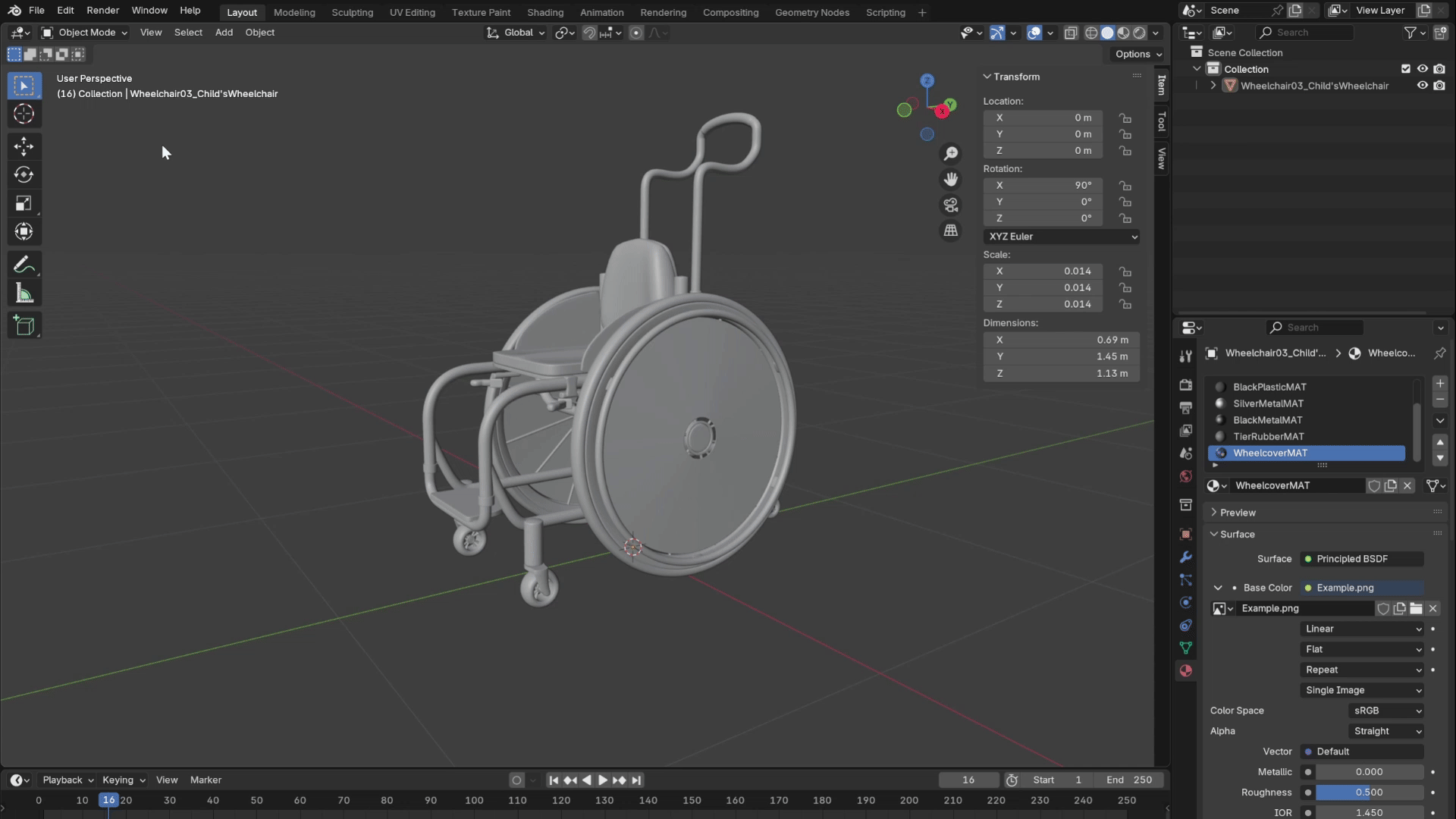 On the Children’s wheelchair (Wheelchair03-Child'sWheelchair_V02 in the complete pack) there is one exception to the above steps, and that’s the final material in that list: “WheelcoverMAT”. If you can’t see this material, hover your mouse over the grey box with the list and scroll down. The colour and patterns on this material is controlled by an image texture that can be swapped out for anything you want