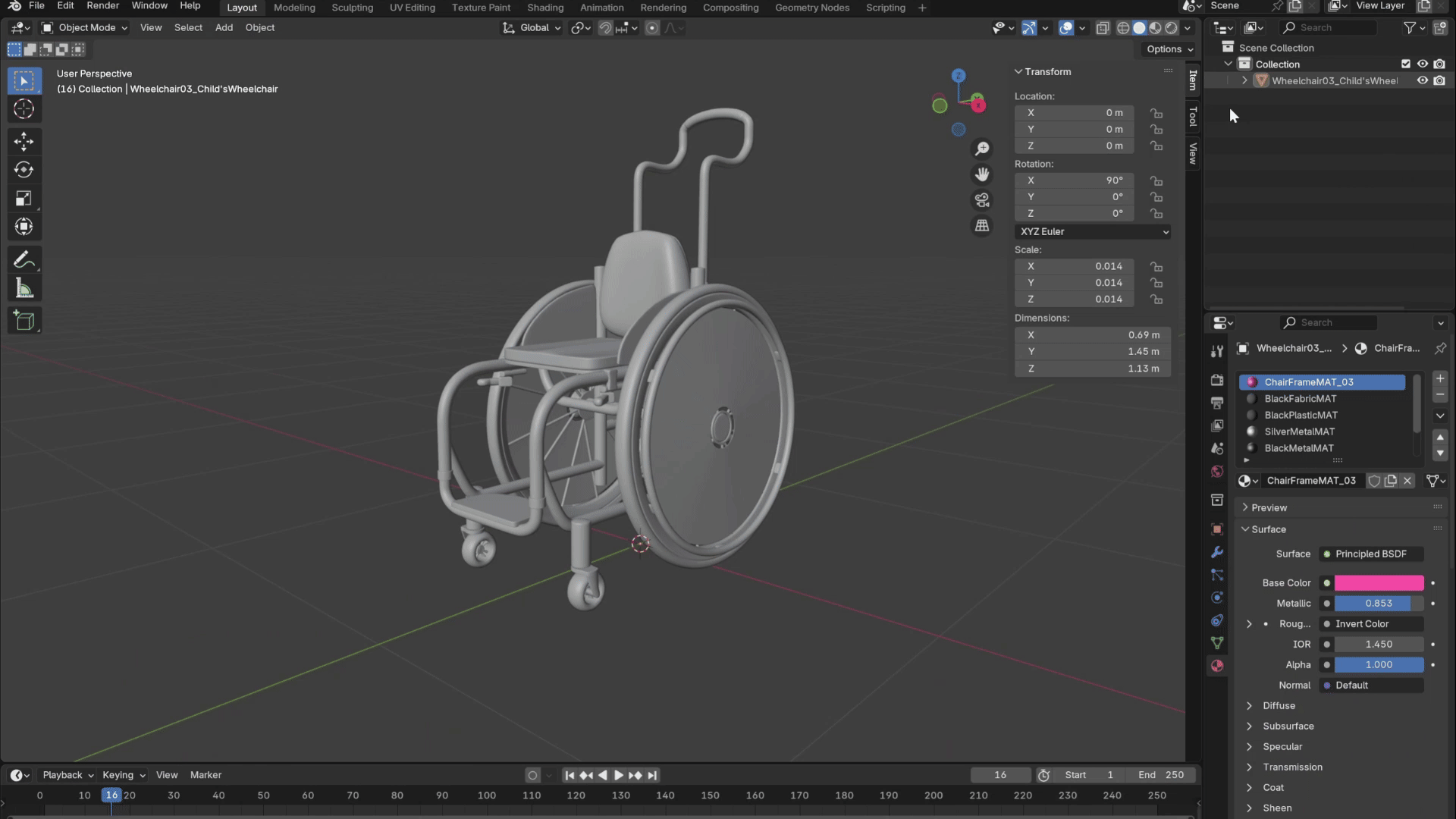 You can edit the colour of the wheelchair models using the material tab of the properties panel (in the bottom right corner of the screen). Each part of the wheelchair models have their own material, (basically, any segment that is a different colour is a different material) but let’s start by looking at the frame of the wheelchair.